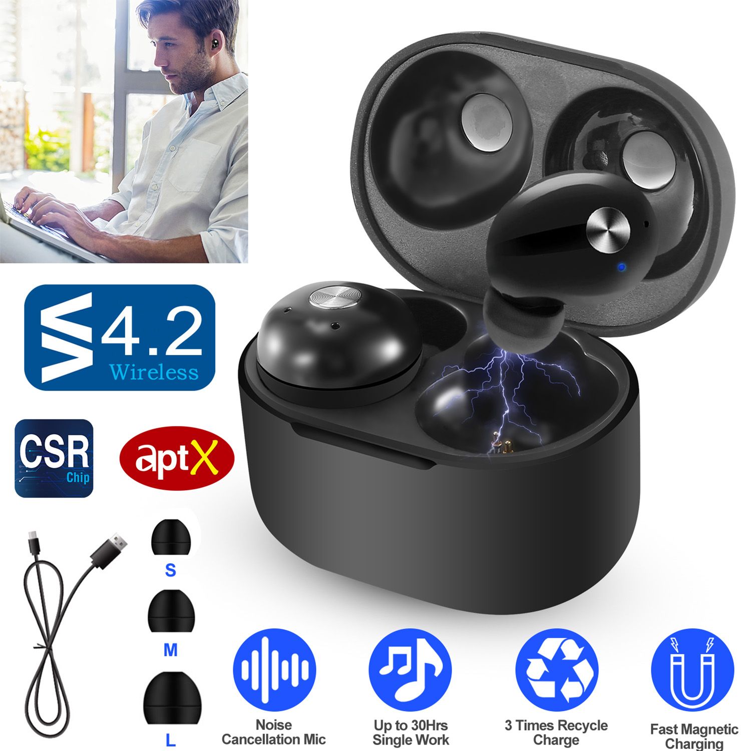 *True Wireless and Total Ear-fit: Ture wireless dual ear stereo design, left and right earbud can be separated, that is, you can use its left and right ear headset solely (Single Track Mode), also can used them in pairs (Stereo Mode). Ultra Mini Size (its diameter is only 20mm), and its ergonomic design guarantees 100% Stable and Comfortable (includes S/M/L-sized ear tips) when walking, exercising, running, climbing, driving, skating, cycling, etc.