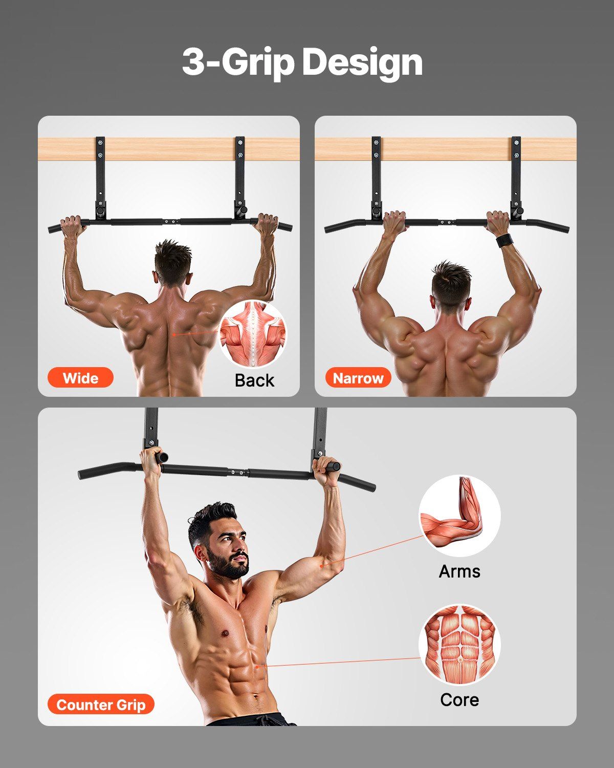 1.42IN Wide Triple Grip: The chin up workout training station features three grip options: wide, narrow, and neutral. It targets the latissimus dorsi, biceps, and core muscles precisely. Customizable training effectively targets multiple muscle groups, optimizing body positioning and maximizing strength